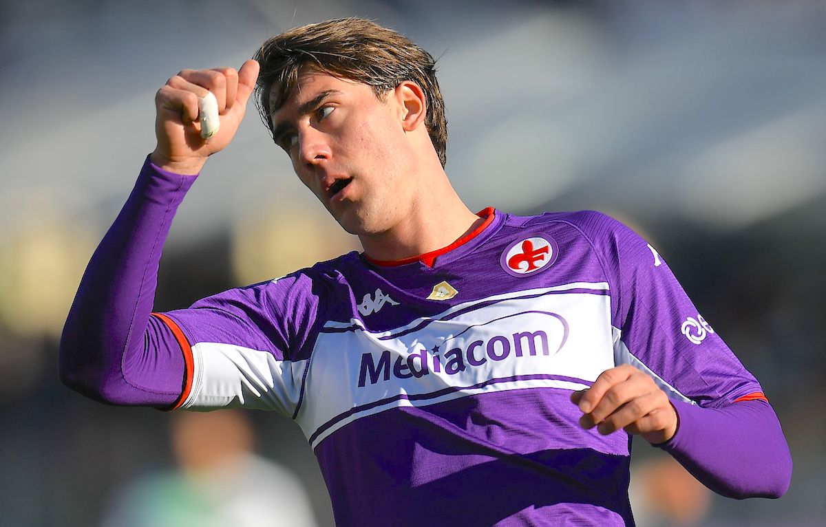 FLORENCE, ITALY - DECEMBER 19: Dusan Vlahovic of ACF Fiorentina gestures during the Serie A match between ACF Fiorentina and US Sassuolo at Stadio Artemio Franchi on December 19, 2021 in Florence, Italy. (Photo by Alessandro Sabattini/Getty Images)