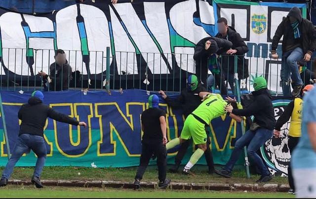 U 17. minutu, pored svih redarskih službi, navijači domaće ekipe, maskirani, pod fantomkama, neometano su ušli na teren kako bi uzeli šal (amajlija koju od svoje 10 te godine nosi na sve svoje utakmice) koji je bio zakačen na mrežu gola, prilikom čega su fizički napali golmana naše ekipe i rukama i nogama mu naneli povrede u predelu glave, nakon čega je Martinović završio u Urgentnom centru i nije mogao da nastavi utakmicu.